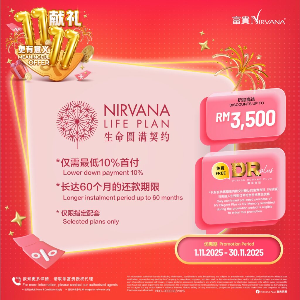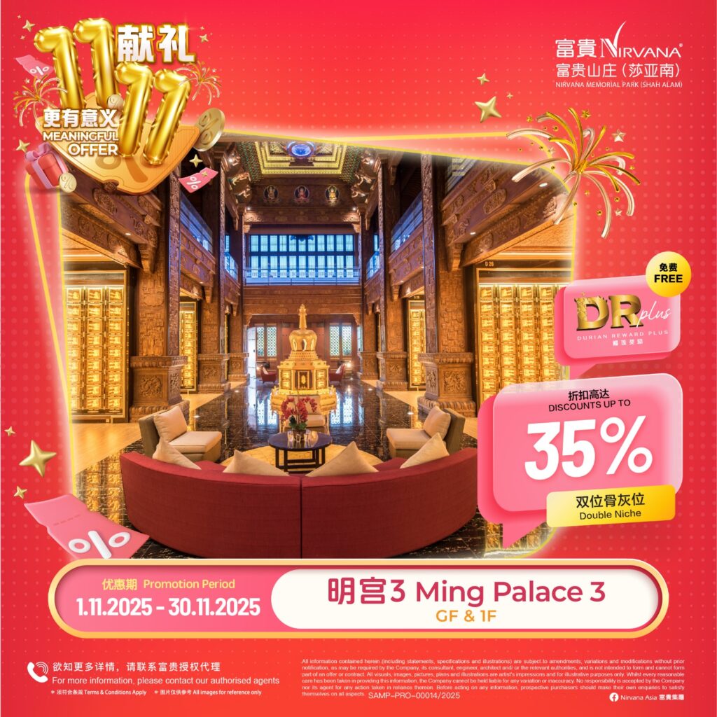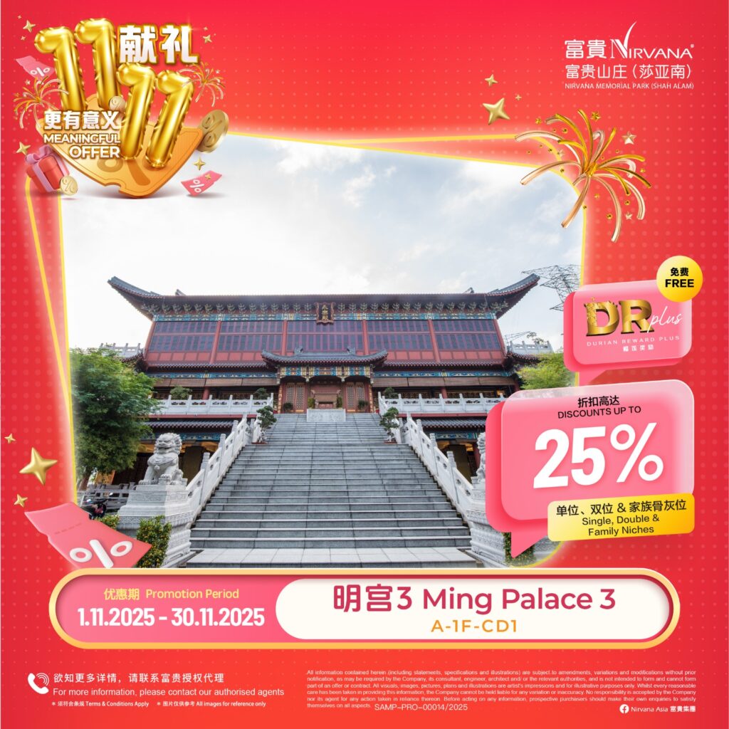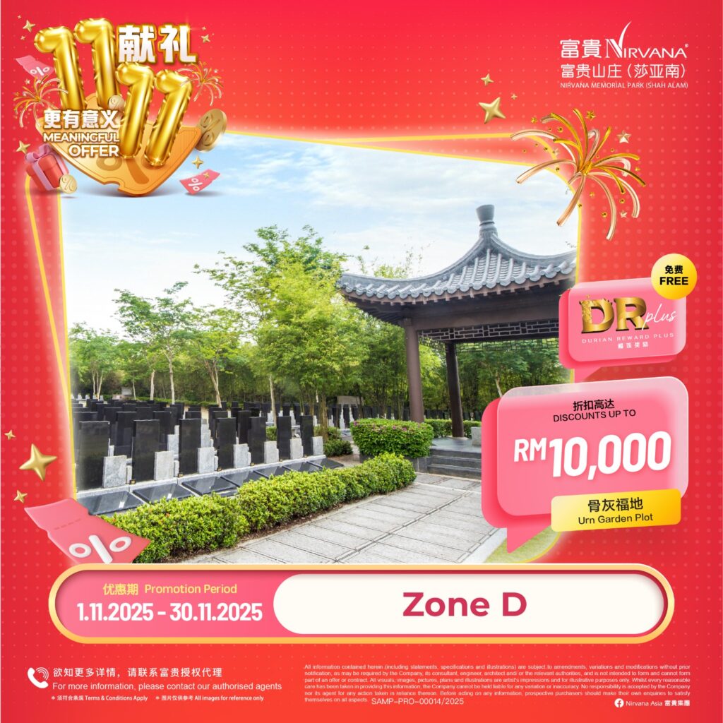 可获得 2 unit DR Plus,回酬率400%的榴莲园奖励金 Exclusive Special Discount up to 20% Discount 头期只需付20% Down Payment 免利息分期付款高达24/36个月 months interest free installment 风水绝佳,福泽子孙!Good Feng Shui -Price shown above for Pre-Need Niche only*- -Maintenance & Facility Fees RM2,000-RM4,000